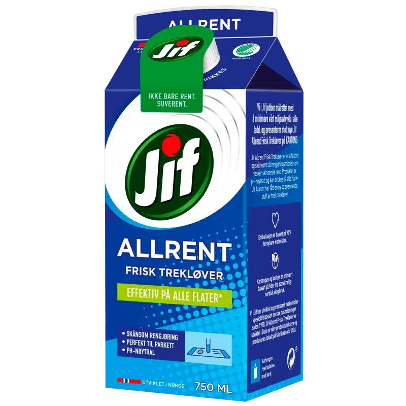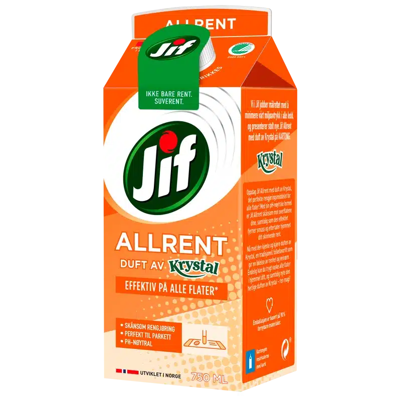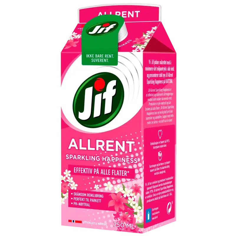 Jif Allrent er et effektivt og skånsomt all rengjøringsmiddel som gir skinnende rene flater. Bruk vaskemiddelet til til generell rengjøring og når du skal vaske gulvet. Produktet er pH-nøytralt og trygt å bruke på alle flater. Jif Allrent kommer i tre dufter. En frisk duft av trekløver, den tradisjonsrike duften av krystal og Sparkeling Happiness med frisk duft av blomster, sandeltre og sitrus.