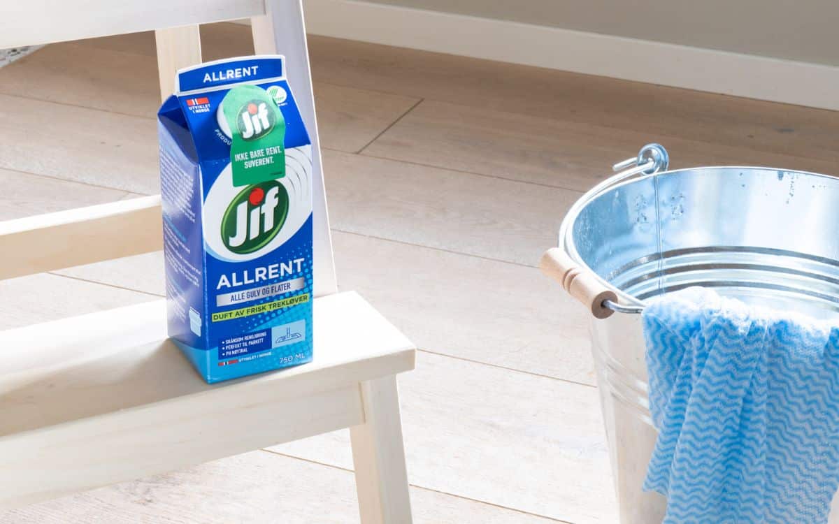 Vaske gulvet med Jif Mopp og engangsvåtmopp.