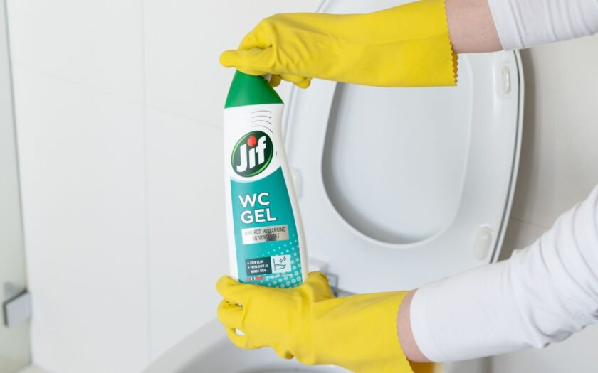 - Bruk baderomsprayen på toalettsetet og skyll/tørk avmed en fuktet klut. Vask toalettskålen med Jif WC-gel.